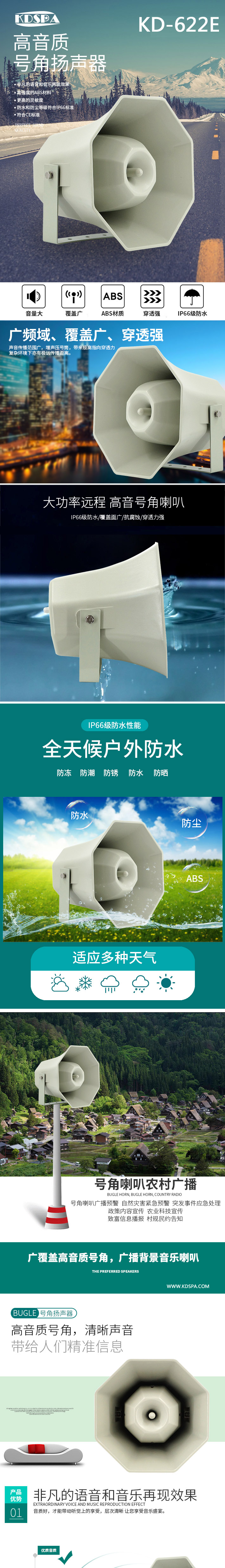 1)根據水電站的主體構造,在大壩外圍選用KD-622E號角式揚聲器。提供平時上下班打鈴、播放音樂以及消防緊急廣播使用。